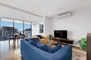 The generously sized bedroom also opens to the balcony with floor-to-ceiling windows revealing yet more amazing views from within. As well, there are mirrored built-in robes, carpeted floors and air conditioning. An adjacent bathroom comes with a large shower while a Euro laundry is conveniently tucked into the kitchen. The master bedroom has incredible iconic views of South Brisbane and boasts a walk through wardrobe leading into the ensuite.