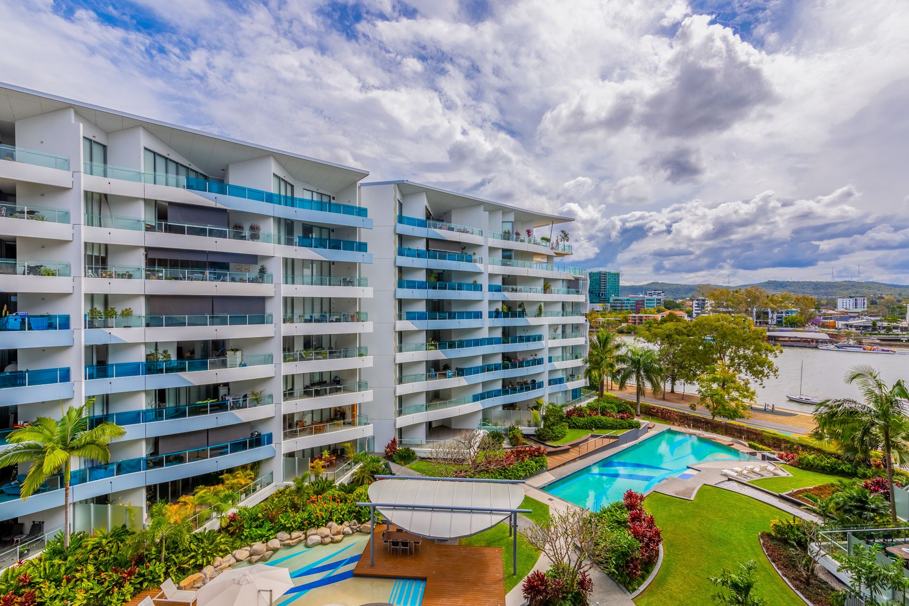 Resort-style amenities set on 4,000m2 of landscaped gardens including two pools and multiple entertaining areas;