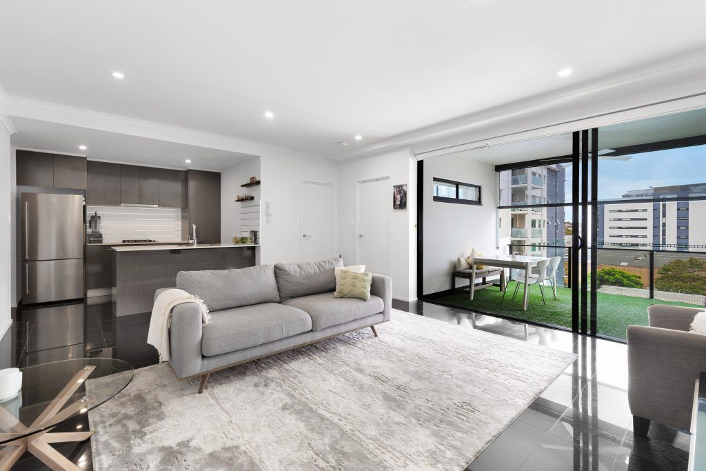 Entering Unit 514, a sought-after open plan layout is on offer – the kitchen opens onto the main living, which flows seamlessly to the entertainer’s balcony. Clever storage solutions can be found within the kitchen, along with stainless-steel appliances, integrated dishwasher, and ample bench space for easy meal preparation. Continuing to the living area, your eyes will be drawn to the black glossy tiles and high ceilings. This space is air-conditioned for your comfort and spills out onto the covered balcony that invites you to relax with a glass of wine and a good book or simply admire the outlook.