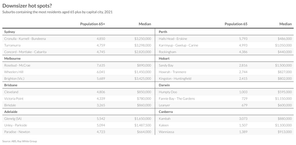 While some suburbs may contain a lot of older Australians because there is a retirement community or aged care facility, the mix of where the most 65 plus years residents are is an interesting mix. It includes some very desirable suburbs such as Glenelg in Adelaide, Sandy Bay in Hobart and Brighton in Melbourne where there are likely lots of families keen to settle into big family homes.