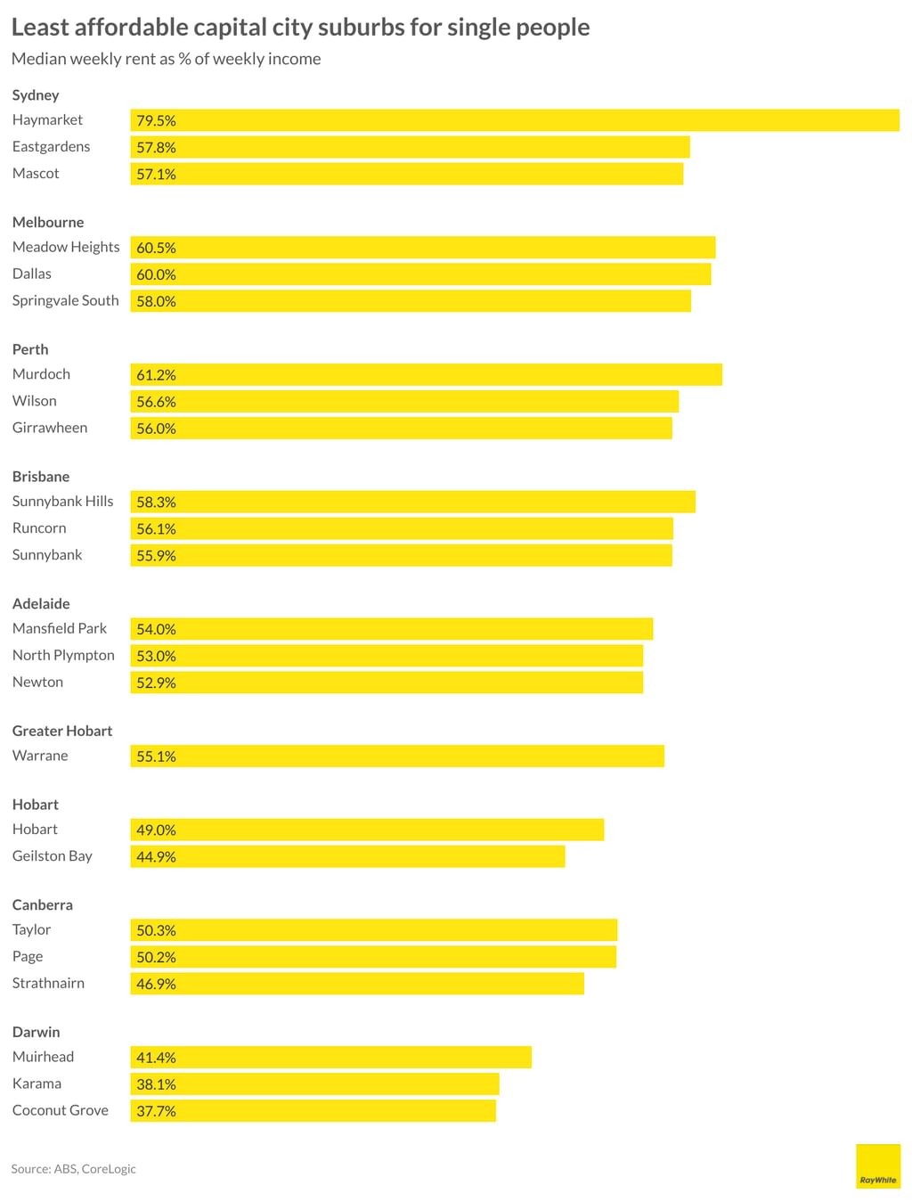 At the other end of the spectrum, the most unaffordable tend to be areas where incomes are comparatively low. Haymarket in inner Sydney has a lot of students and hence lower incomes. The ratio of rental payments for a unit relative to a single person’s income is high.