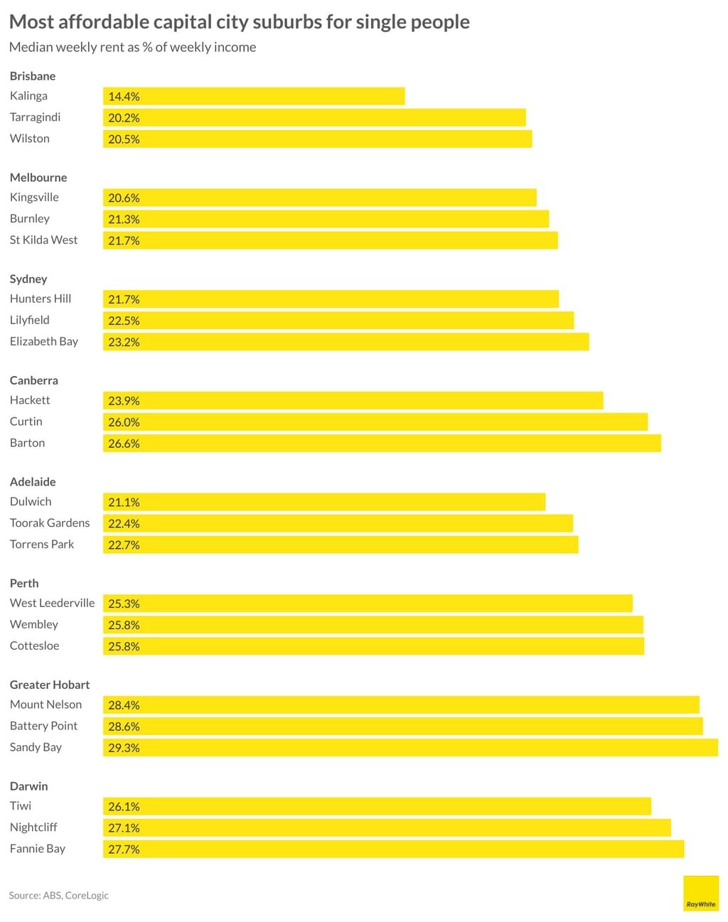 By suburb, the results are a little bit more unusual. Many of the most affordable for a single person are in expensive areas. This is because incomes are very high in expensive areas but typically rents are relatively low in comparison, particularly in areas where there has been a lot of development.