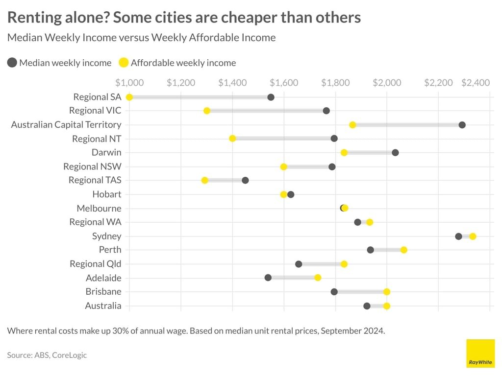 The chart below compares median weekly income to that income required to rent a unit affordably (spending no more than 30 per cent of total income). As an example, Sydney average weekly income for 2024 is estimated to be $2,278. To rent a unit affordably, you would need to earn at least $2,333 (based on average weekly unit rent for Sydney of $700 per week). In this case, Sydney is unaffordable for a single person to rent a unit.