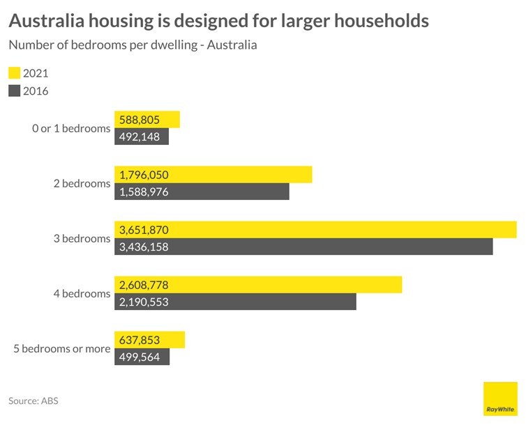 Not only do we need more homes for more people, we are also spreading out more, and most of our homes have been built for big families, containing three or more bedrooms. The household type that is set to see the strongest growth is ‘single person’ and households are getting smaller. At the same time, the house type with the strongest growth currently has four bedrooms. This is leading to a lot of spare capacity in homes. Remarkably, 75.4 per cent of couples without children live in homes with two or more spare bedrooms. This disconnect between household size and housing stock points to a deeper structural issue in the market.