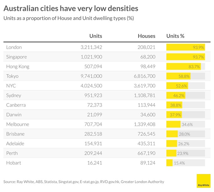 Australian cities face unique challenges in adapting to these changes. Compared to international cities like London and Singapore, where over 90 per cent of dwellings are units, Australian cities remain predominantly low-density. Melbourne and Sydney have just 34.6 per cent and 46.2 per cent units respectively, making it harder to meet changing housing needs efficiently.