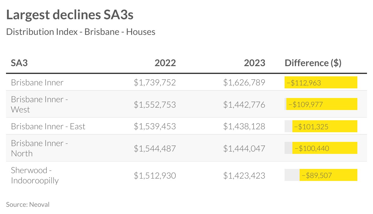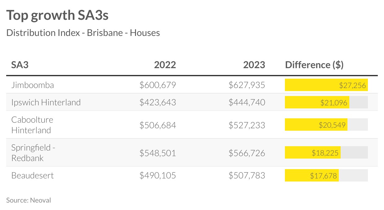 The comparative strength in Brisbane is showing up at a local area level. Unlike in Melbourne and Sydney, not all suburbs are recording price drops. More similarly though is that the areas that are the top performers over the past 20 years, and through COVID, have seen the biggest declines. Inner Brisbane is the most expensive region and has also seen the biggest declines. In contrast, lower priced areas are still increasing, perhaps driven by investor interest in these areas, as well as lower mortgages. Jimboomba has seen prices rising by almost $30,000 since last February.