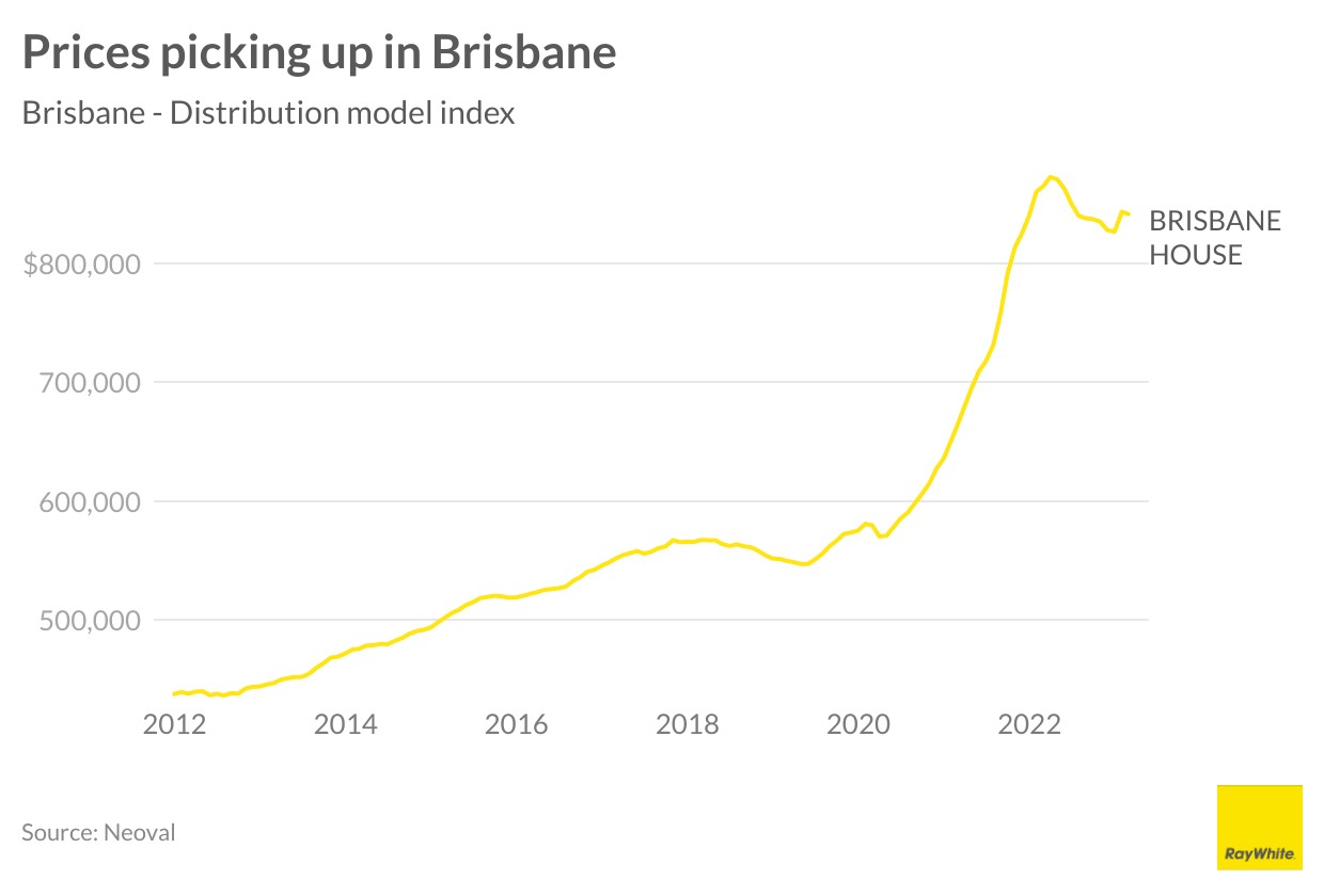 A shortage of homes is biting hard in Brisbane. Population growth in Queensland is the strongest in Australia and at the same time, the value of homes being constructed has fallen by six per cent. At the same time, an infrastructure and non-residential building boom is taking trades away from new homes being built. This is most immediately showing up in rental growth. Advertised rents have risen by 32 per cent over the past two years. However, it’s also keeping house prices far more elevated than what you would expect in such a rapidly rising interest rate environment. House prices hit a low in December and are now back to where they were mid-last year.