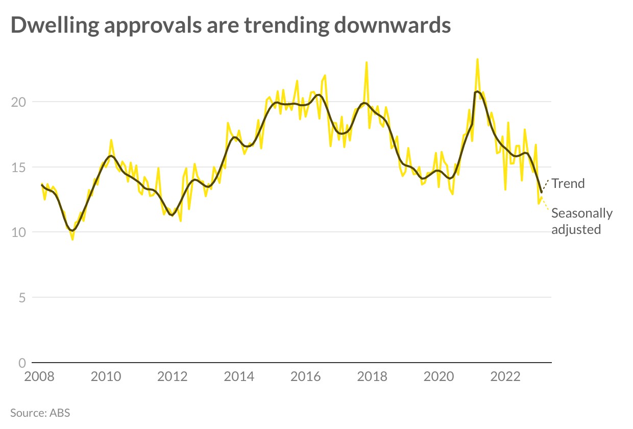 The number of new homes being approved is now trending to its lowest level in over a decade. In February, 12,661 dwellings were approved, a 30 per cent decline from 12 months ago. In historic terms, this is exceedingly low but many of these homes will not be built quickly given construction cost increases. Many people who would otherwise have bought a new home will be pushed to the established market. Either because the cost to build a new home is too high, it is difficult to find a builder or simply there is no availability in the suburb they want to live in.