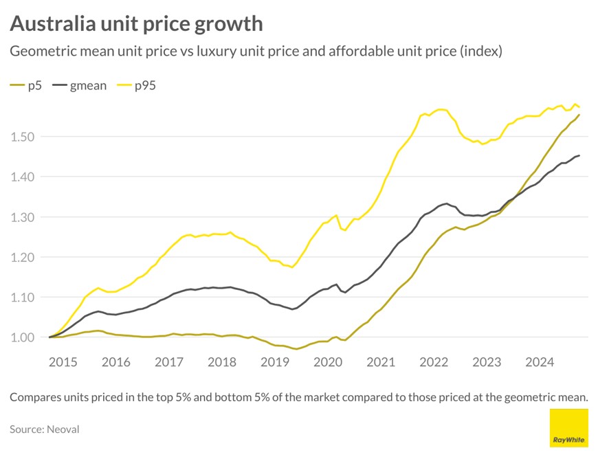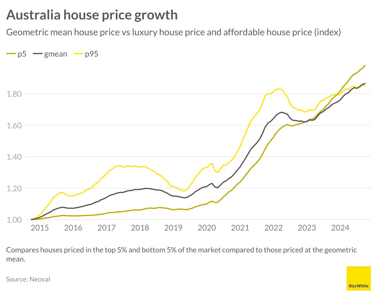 The Australian housing market is experiencing a notable shift, with affordability driving unexpected trends across different property types. Affordable house price growth is now outpacing the luxury market. While the opposite is now occurring for apartments.