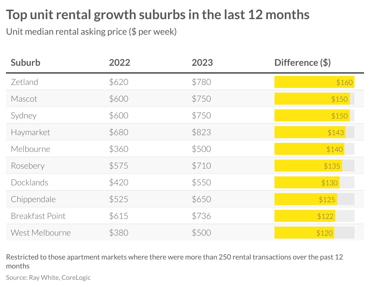 With students returning, rents are increasing quickly. In Melbourne CBD, they have increased by almost 40 per cent over the past 12 months and are back to pre-pandemic levels. While in Zetland and Mascot they have increased by over 25 per cent.
