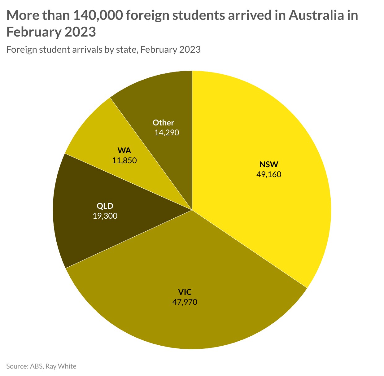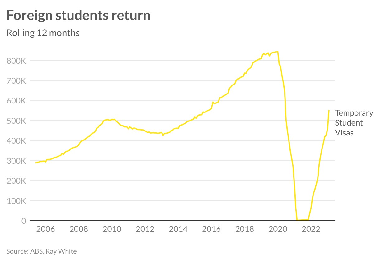 In February, over 140,000 foreign students returned to Australia and the number of students arriving on temporary student visas is slowly returning to pre-pandemic levels. While this is good news for universities, as well as employers that rely on students such as hospitality, it is also good news for many apartment markets.