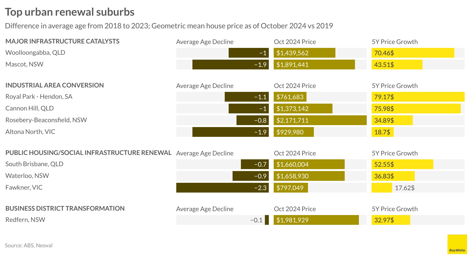 To establish the list of where urban renewal has been most successful, we looked at established areas that not only have seen a drop in age, but also significant price growth. To further refine, we had a look at some other markers of urban regeneration. These were chosen to be major infrastructure changes, industrial area conversion, social infrastructure renewal and business district transformation. In the end, ten suburbs were chosen as being most successful at urban renewal, thereby attracting young people and seeing higher demand.