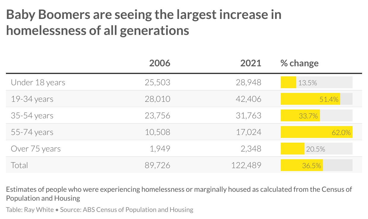 But while Baby Boomers have undoubtedly done the best from housing of all generations, a more worrying statistic is the rapid rise in homelessness amongst this age group. Over the past 15 years, people aged 55 to 74 years have seen a 62 per cent rise in homelessness, the highest of any age group.