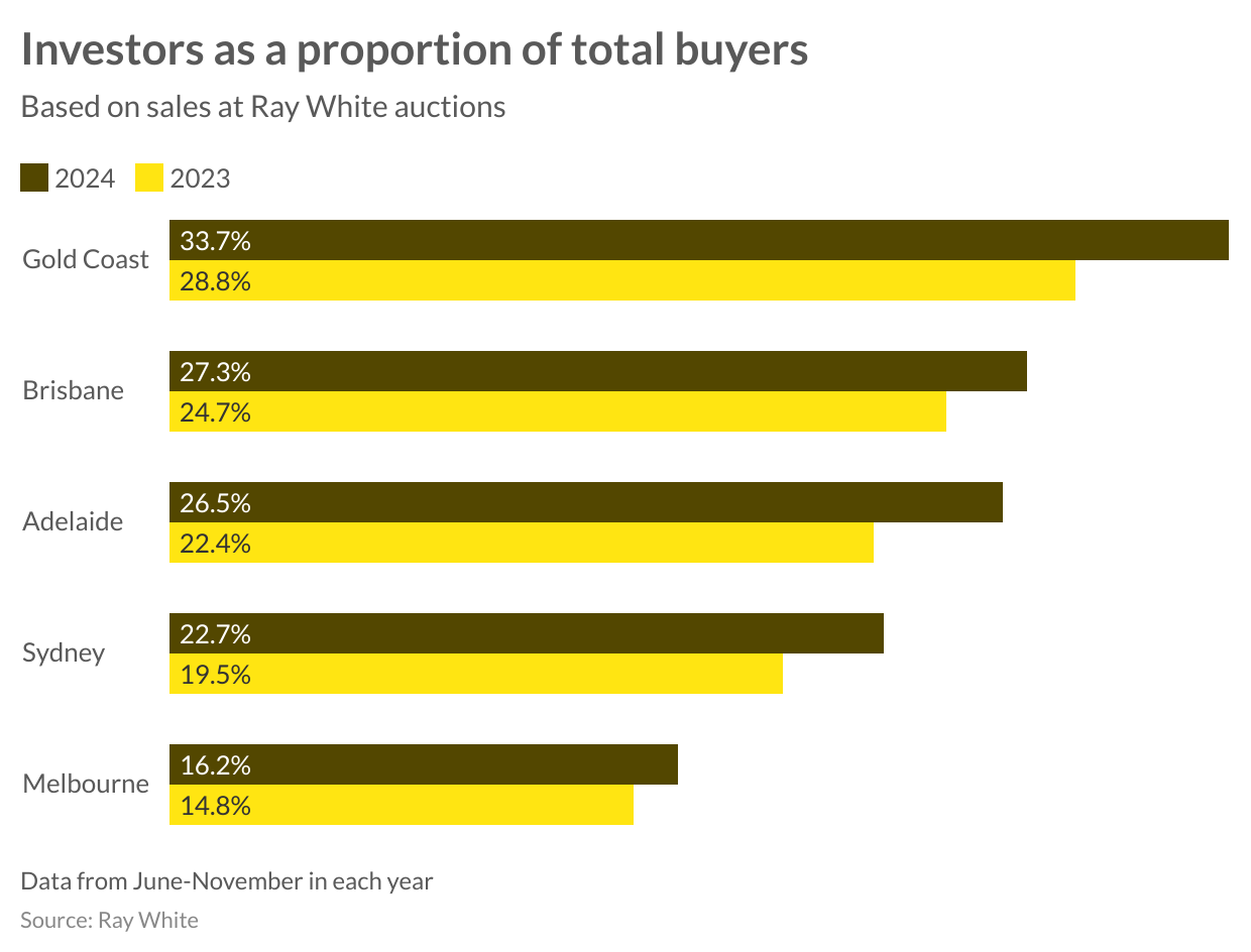 The Gold Coast stands out in their results – investors now make up 33.7 per cent of buyers at auctions, up from 28.8 per cent last year. While fewer people from interstate are buying on the Gold Coast compared to last year (down from 27.4 per cent to 18.4 per cent), it’s still a popular choice. Brisbane is also doing well in Ray White’s auction results, with investors making up 27.3 per cent of buyers, higher than last year’s 24.7 per cent.