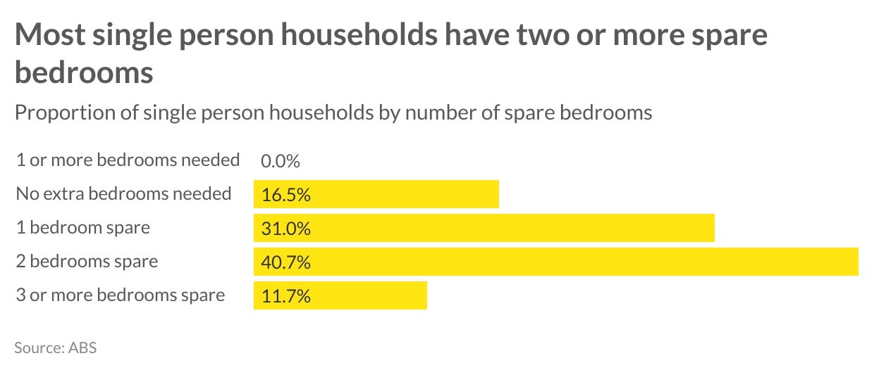 Australia is dominated by houses with three or more bedrooms. Most households with just one person have more than two spare bedrooms. While there is likely a preference by some to have a lot of spare rooms, the reality is that finding a home with just one or two bedrooms is difficult unless you want to live in a high density area or in a high rise apartment building. There is a growing requirement for smaller medium density homes, particularly in inner and middle suburbs around Australia.