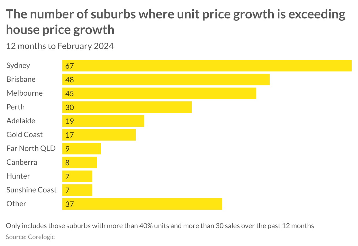 In total, there were 294 suburbs where unit price growth exceeded house price growth. Sydney, Brisbane and Melbourne dominate, partly because they are the biggest cities. However, it is also likely that a larger number of high quality apartments being developed is lifting the median.