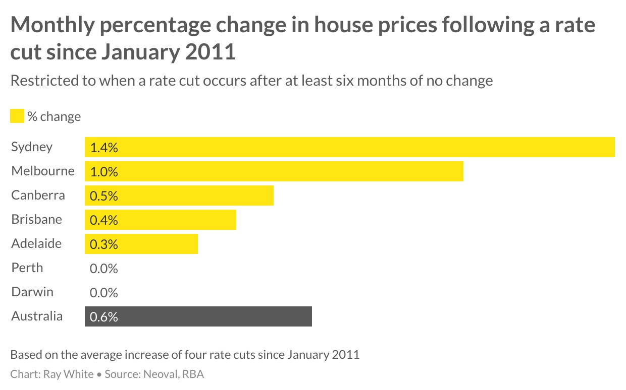 The results are not surprising. Since January 2011, the city that has had the biggest jump following a rate cut has been Sydney, followed by Melbourne then Canberra. All these cities are the most expensive in Australia and therefore it makes sense that they would be more sensitive to the cost of borrowing. Perth and Darwin saw no increase, reflecting relatively stagnant markets during this time but also their lower sensitivity to interest rate changes.